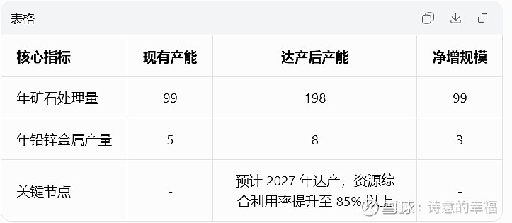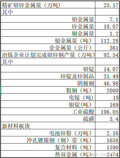 年产精矿铅锌金属量 30 万吨、冶炼铅锌产品 45 万吨、阴极铜 45 万吨、铝型材2.1 万吨、电池锌粉 2 万吨、复合金属材料 5400 吨。其中,乘用车天窗铝导轨型材销量、电池锌粉、镍氢镍镉电池极板材料、热双金属等业务排全国细分市场前列。