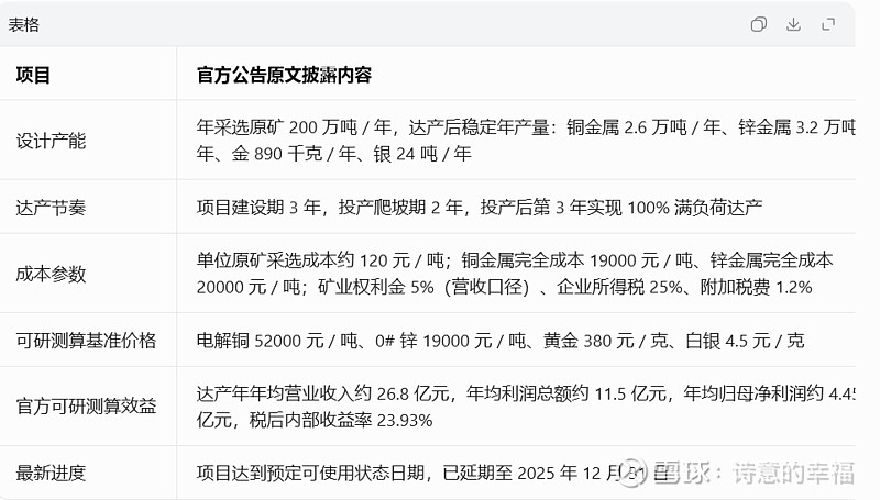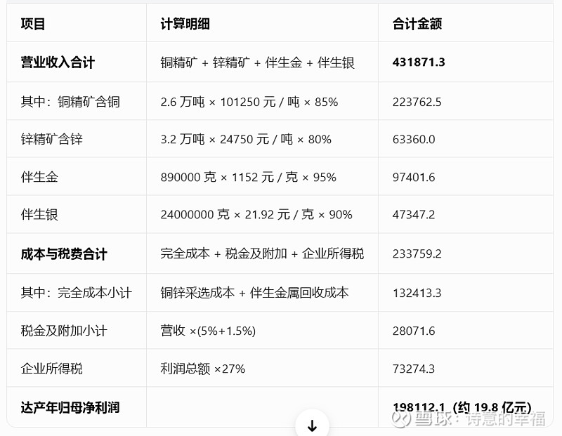 按公司的设计产量和目前的铜价(单价:101250)计算达产后的营收和归母净利润计算如下: