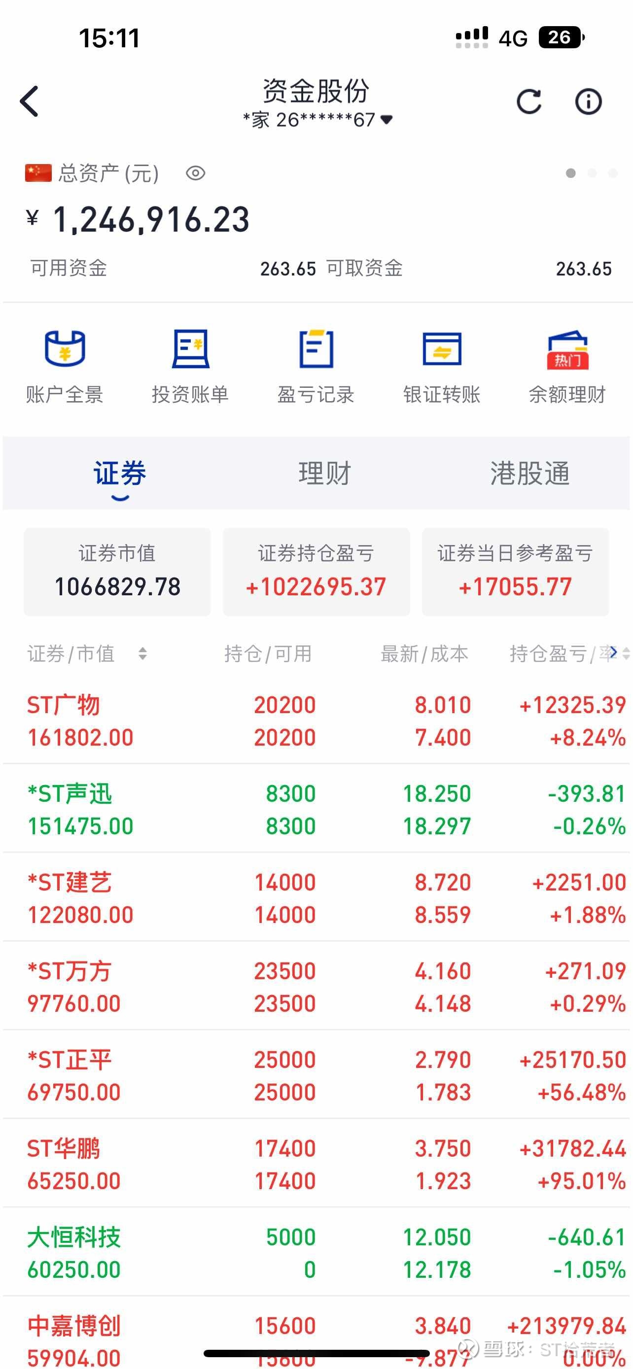 我炒st大概率只做补涨,我觉得YY一些逻辑挺没用也挺不负责的,在补涨的基础上YY是合理的,都在补涨时有YY逻辑的可能会率先反弹,ST唯一能让我硬持有的逻辑就是摘帽,其他的我都拿不久,一般反弹个5-10个点就走了,运气好买到连板的开板当天也会出不少,以前拿20–30万炒股的时候买的票少且激进,渴望搏一搏,现在资金慢慢做起来了反而胆子比较小,持股比较分散,对我来说除了等摘帽的,其他票只要赚钱就跑,然后看情况高切低。这波ST行情能走几天不知道,但我觉得应该是百花齐放的小行情,今天账户继续创新高!出了一些也买了一些,珍惜当下的机会!加油干!$ST板块(BK0400)$ $*ST万方(SZ000638)$