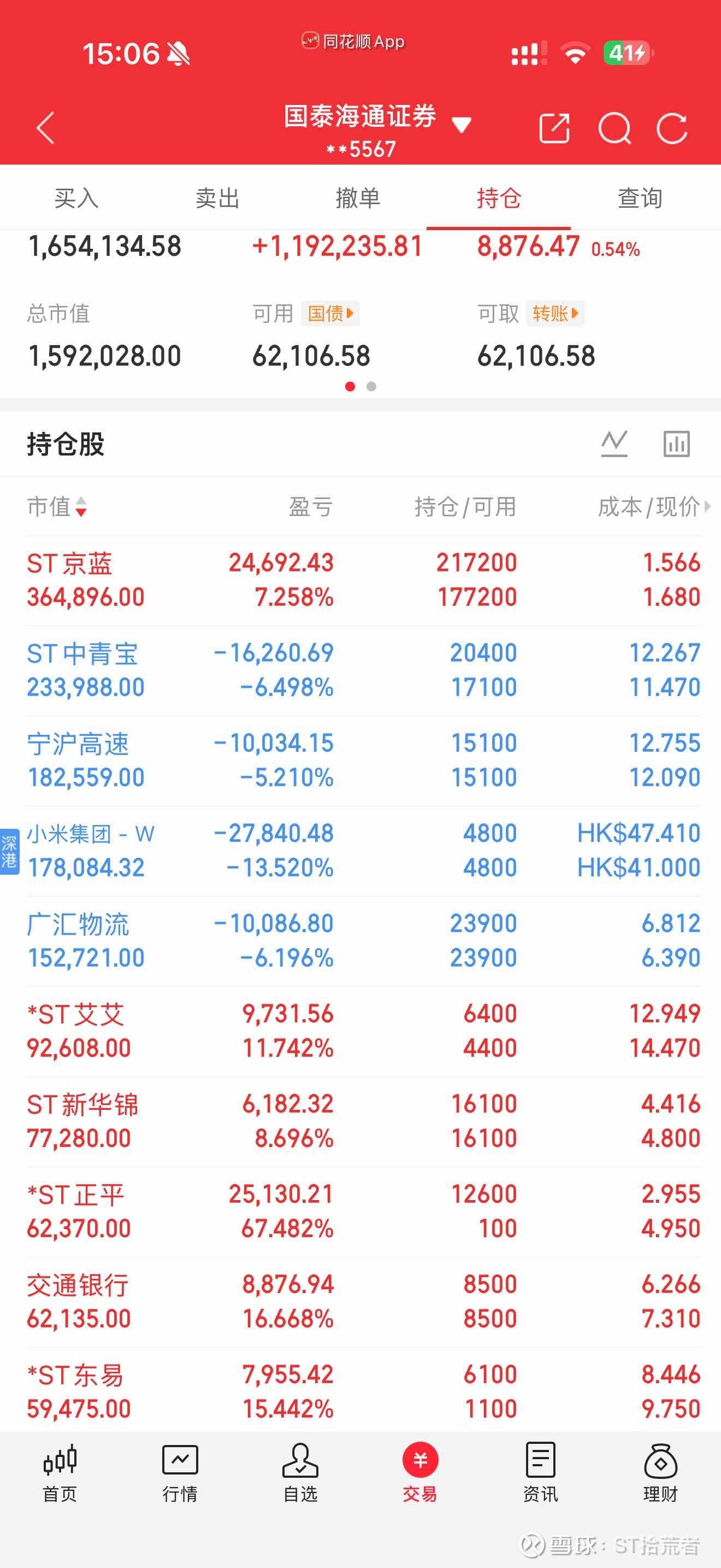 早上又充了点,然后做了一下T,勉强红了!跌时候稀里哗啦,反弹时又磨磨唧唧,难搞哦。尾盘竞价上了一些$*ST正平(SH603843)$ ,看明天怎么走,持仓的票除了新华锦是纯短线,其他都多少带点逻辑,仓位越大,逻辑却硬,不管这一天的涨跌,把时间周期拉长一些。