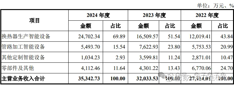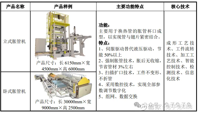 公司主要产品包括换热器生产智能设备、管路加工智能设备和其他定制智能设备(环保设备、锂电池热压整形设备和风电叶片根部数控铣削机等)。