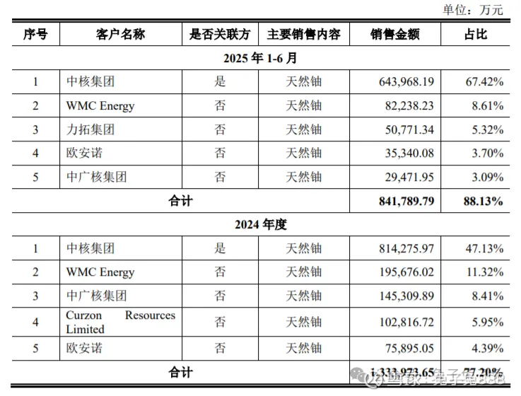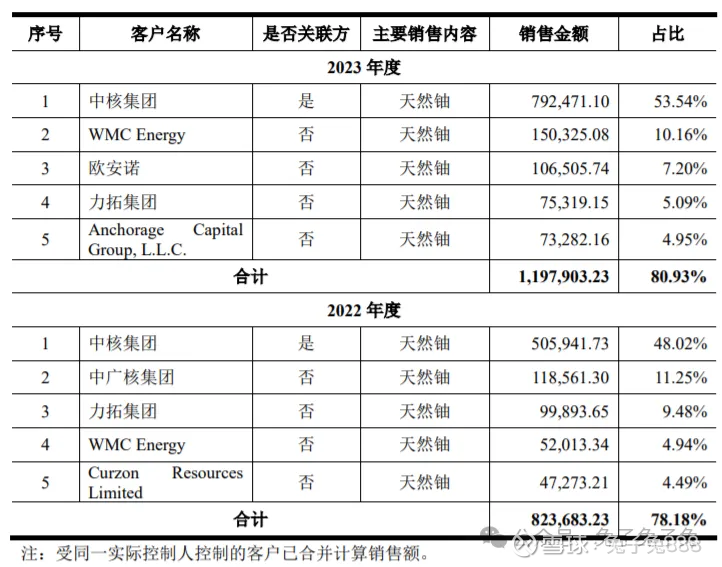 客户相对集中的风险:报告期各期,公司向前五大客户的销售金额占当期营业收入的比例分别为 78.18%、80.93%、77.20%和 88.13%,客户集中度较高。其中,对中核集团的销售金额占公司营业收入的比例分别为48.02%、53.54%、47.13%和67.42%。由于核电行业的特殊性,我国的核电项目均由中核集团、中广核集团、国电投集团和华能集团独立或合作开发运营,公司是中核集团内天然铀产品独家供应商,因此,公司天然铀产品的下游客户相对集中且稳定。若公司下游行业或主要客户的经营状况、业务结构发生重大变化而减少了对公司产品的采购需求,或公司在交货期、交付量等方面无法及时满足下游客户需求,同时公司不能及时开拓 新的客户或业务领域,可能对公司经营业绩产生不利影响。
