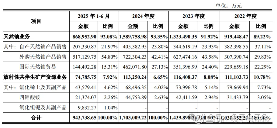 公司专注于天然铀和放射性共伴生矿产资源综合利用业务的矿业公司,报告期内主要从事天然铀资源的采冶、销售及贸易,以及独居石、铀钼、钽铌等放射性共伴生矿产资源综合利用及产品销售。