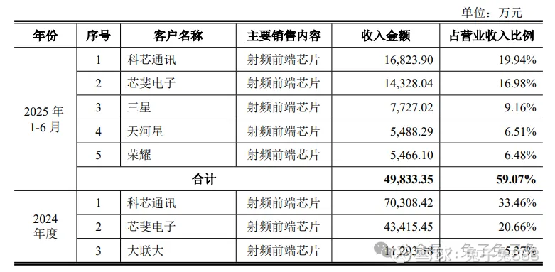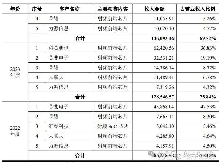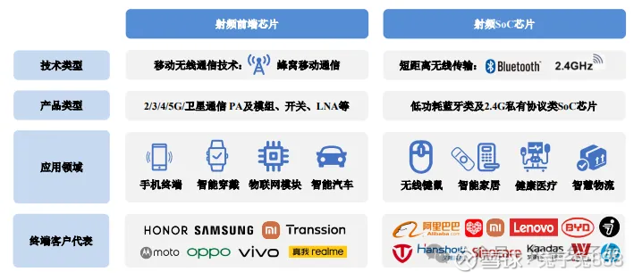 公司射频前端芯片产品已在荣耀、 三星、vivo、小米、OPPO、联想(moto)、传音、realme 等知名品牌终端客户实现规模销售。同时,公司射频 SoC 芯片产品已经导入阿里、拼多多、小米、联想、客户 C、客户 D、比亚迪、九号、台铃、汉朔、三诺医疗、凯迪仕、华立科技、惠普、客户 G、Remote Solution 等知名客户,覆盖无线键鼠、智能家居、健康医疗、智慧物流等多元物联网应用场景。