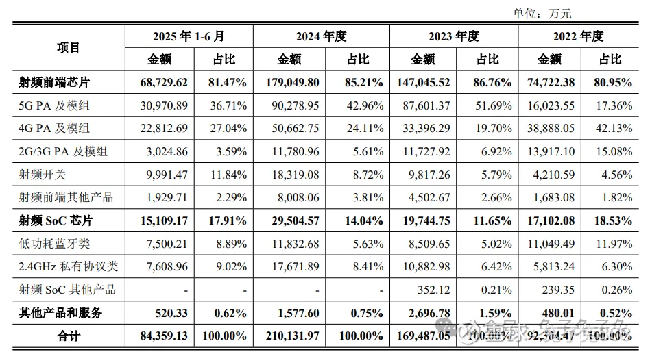 公司聚焦射频通信领域,报告期内,公司核心产品线主要包括面向智能移动终端的 5G/4G/3G/2G 全系列射频前端芯片产品 (包括射频前端模组及功率放大器、开关、LNA 等)以及面向物联网的射频 SoC 芯片产品(包括低功耗蓝牙类及 2.4GHz 私有协议类无线通信芯片)。