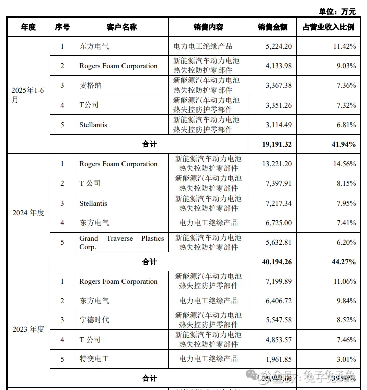 公司聚焦新能源汽车热失控防护领域,目前已成为多家全球知名整车制造商及电池生产商的一级供应商,与通用汽车、福特、 Stellantis、T公司、现代起亚、丰田、宝马、吉利、零跑、小鹏、一汽集团等整车制造商,以及宁德时代、欣旺达、蜂巢等电池生产商在内的行业领军企业建立了长期稳定的合作关系。在电力发电设备领域,主要客户包括东方电气、上海电 气、哈电集团等大型发电设备制造商;在特高压输配电领域,公司与特变电工、 思源电气、南京电气、中国西电等输配电龙头企业保持深度合作。