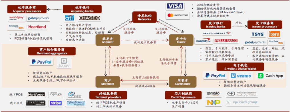 在支付产业链中,发卡/收单银行、银行核心和辅助服务商、发卡/收单服务商(issuer/acquire)、商户支付服务商、清算机构、终端提供商、芯片制造商等各类玩家涌现,共同支撑并推动整个美国支付体系的发展。