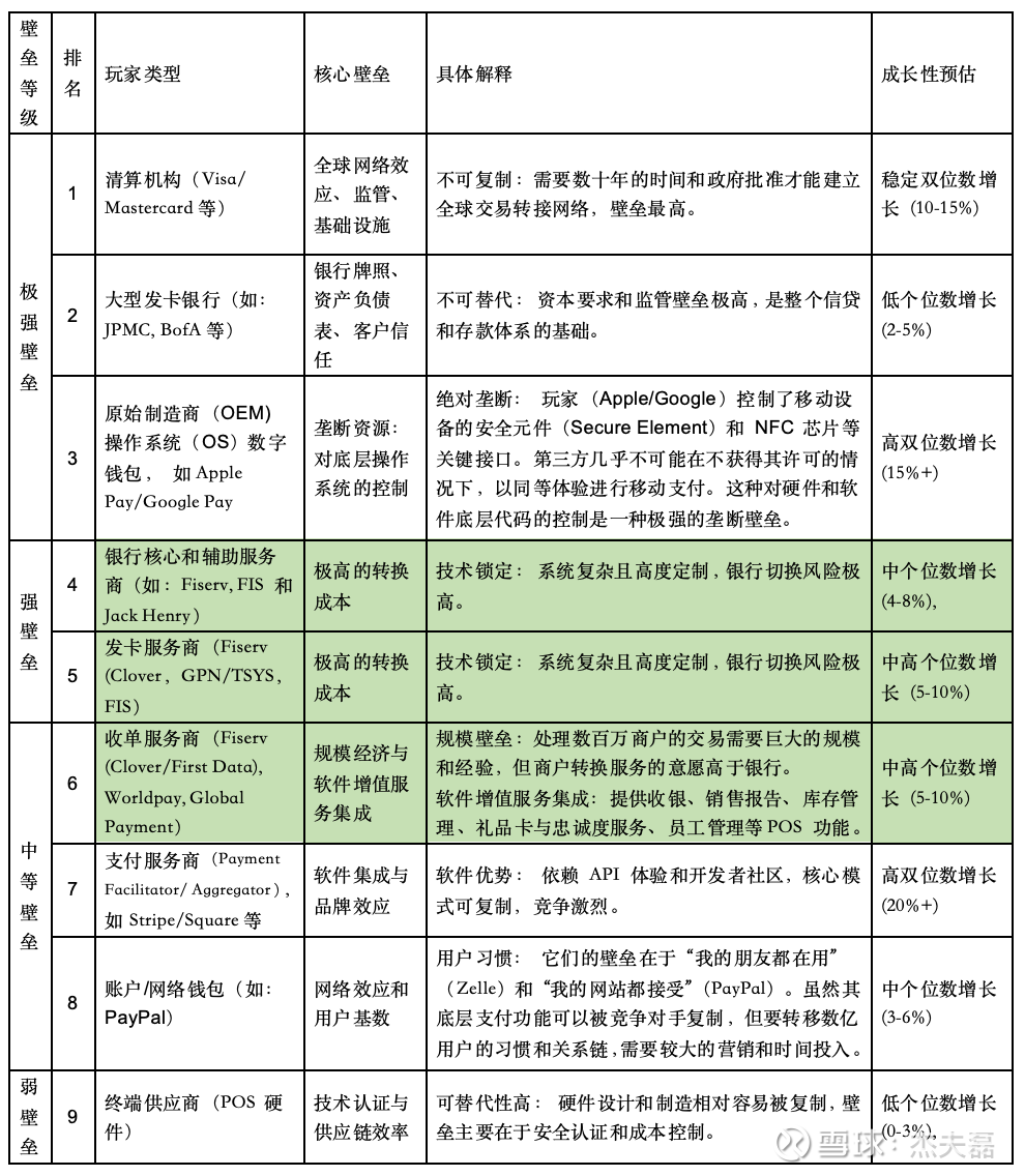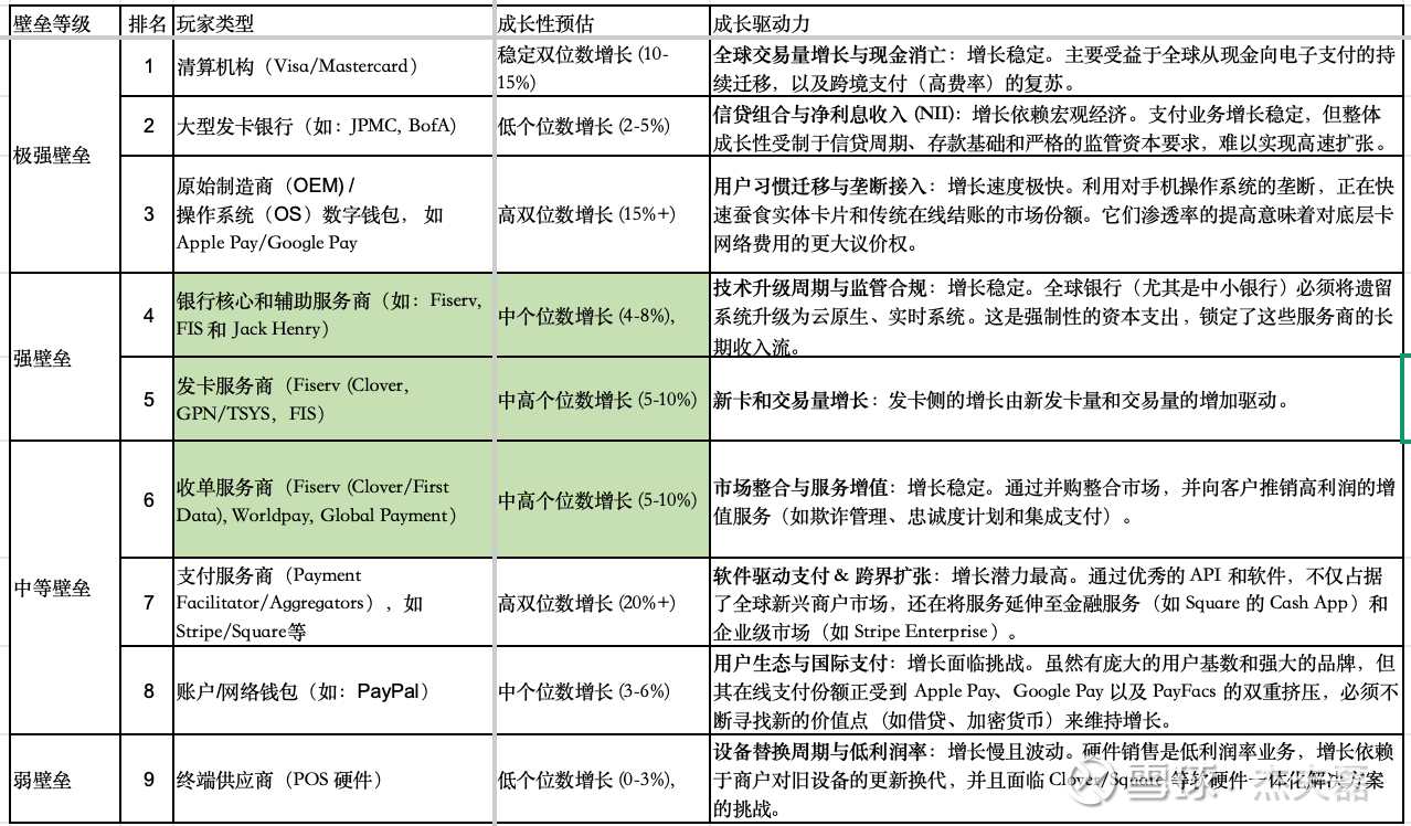 下面是去年做的一些关于行业生态和主要玩家竞争壁垒强弱的总结(略有更新);接下来会对Fiserv和主要竞争对手的最新业务趋势和估值情况做一些简单的总结。(声明:纯属个人观点,不作为投资建议;本人只是在60美元左右建了一些底仓。)