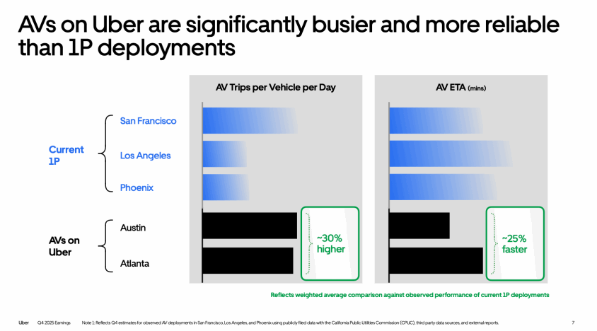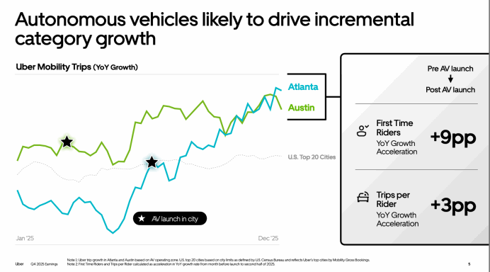 早期数据也印证了这一观点。在奥斯汀和亚特兰大,数百辆自动驾驶车辆在优步平台运营,当地整体订单量(含自动驾驶与人工驾驶)增长显著加速,这两个自动驾驶运营区域已成为美国增长最快的市场之一。令人振奋的是,市场增长既源于首次使用优步的新用户激增,也得益于老用户使用频次的提升。重要的是,尽管两座城市的自动驾驶渗透率不断提高,但得益于混合网络模式,人工司机的数量及其小时平均收入均实现同比增长。