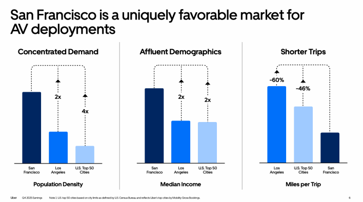 同时,即便在旧金山这类优步尚未推出自动驾驶服务的城市,市场内自动驾驶运力的增加也推动了整个行业的规模扩张。2025 年,优步在旧金山的订单量加速增长,且增速高于美国整体水平。未来 12 个月,公司将在旧金山推进自动驾驶部署,我们对湾区市场的发展充满信心。