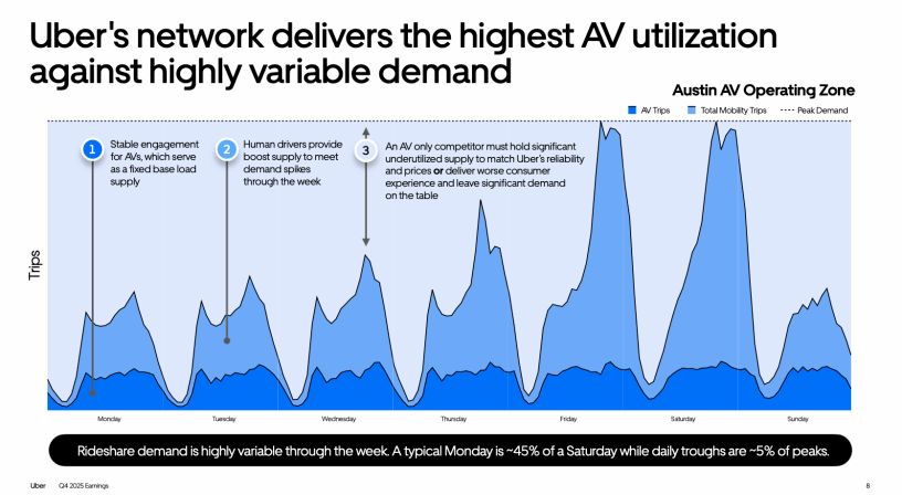 研发自动驾驶车辆,与打造全球网约车市场平台是两个完全不同的概念。网约车需求的波动性极强,即便是在一周内,需求变化也十分显著。例如在奥斯汀,周一的日均需求约为周六的 45%,而单日需求低谷仅为一周峰值的 5% 左右。季节性需求变化,以及特殊活动带来的需求激增,进一步放大了这种波动性。这也是我们坚信,人工司机与自动驾驶结合的混合网络,能为优步及其合作伙伴带来最高的资产使用效率与营收增长机遇的原因。