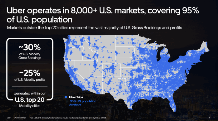 事实上,美国市场由数千个城市、郊区、城镇和乡村构成,形成了长尾市场,各区域的市场特征与监管要求差异显著。过去 15 年,公司不断优化并提升服务能力,覆盖前 20 大城市以外的广阔区域,成效显著:这些区域的增长速度更快,目前利润率也已更高。换言之,即便未来 5-10 年自动驾驶在人口密集的城市广泛普及,我们仍将以人工驾驶为核心,服务于更广阔、持续扩张的城镇与郊区市场。约 40% 的美国用户会在常住城市以外的地区使用优步服务,这意味着用户期待我们的服务无处不在、随叫随到。