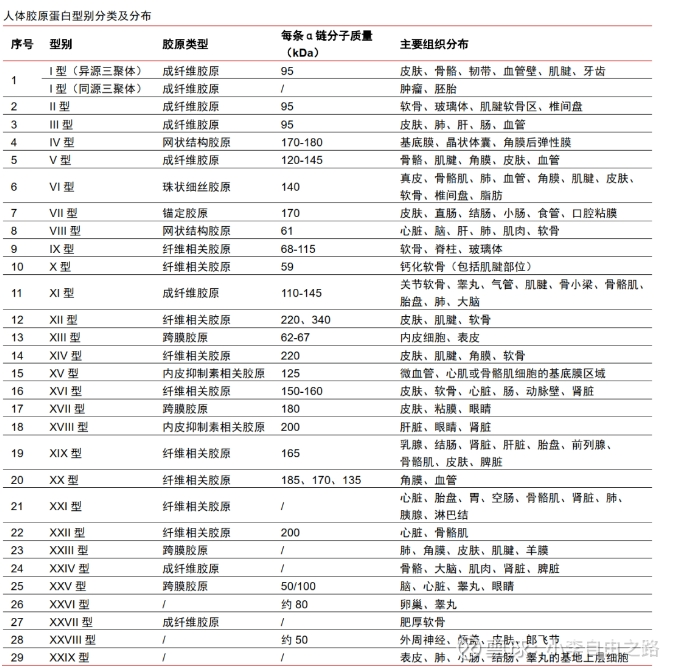 目前人体中发现了至少29种胶原蛋白,在医美和美妆中研究和应用最广的是 I、Ⅲ型。