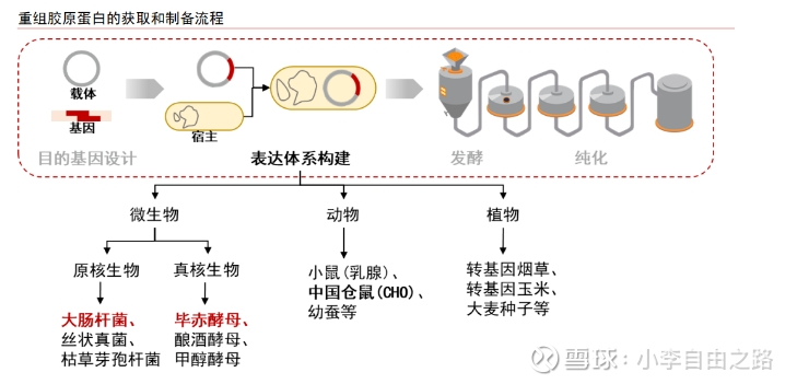 目前的胶原蛋白生成主要分为重组胶原蛋白和动物源胶原蛋白。重组胶原蛋白相比动物胶原蛋白有很多优势,这里主要讨论重组胶原蛋白。