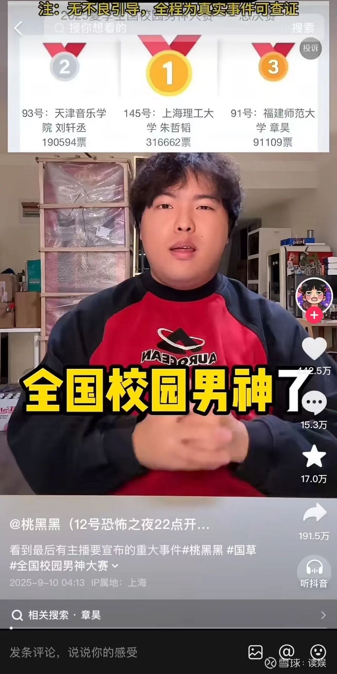 观众在他身上获得的不是知识增量,不是操作提升,而是一种“有人在那儿”的踏实感,以及和她们站在一起的嘴替,一个能与她们想说却没说出的话的共鸣者。这解释了为什么他临时取消《纸嫁衣》直播能上热搜,粉丝生气不是因为他“鸽”了,而是失落感作祟,她们习惯了一个人每天这个时间出现,今天他没来。也解释了为什么“校园男神大赛”事件中,粉丝会产生那么强的“逆反式”投票冲动,当桃黑黑说“别投了”,粉丝的潜台词是:我的喜欢不需要你批准。