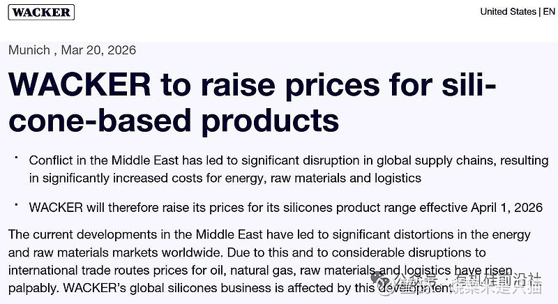 $江瀚新材(SH603281)$ 此次调价的核心诱因的是中东局势动荡:冲突导致国际能源市场剧烈波动,原油、天然气价格暴涨,同时霍尔木兹海峡通航受阻推高物流成本,让瓦克化学全球有机硅业务板块面临巨大成本压力。作为全球最大的有机硅产品制造商之一,瓦克化学的硅业务涵盖硅油、弹性体、硅烷等2800余种产品,广泛应用于汽车、建筑、医疗等多个领域,2025年该板块贡献了集团约50%的销售额。