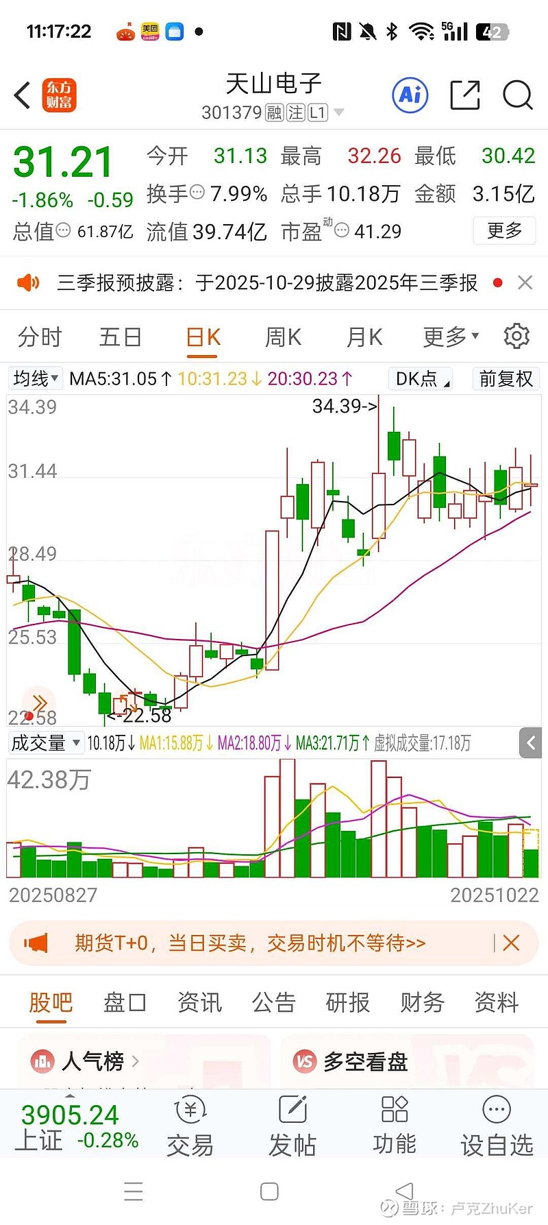 $天山电子(SZ301379)$ 突破平台放量后的缩量,假如是洗盘,那么向上空间至少还有50%以上,芯片整体调整他能横盘也算强势了,只要大盘调整完突破4000点,他能继续向上的话应该就是一波巨大的趋势行情