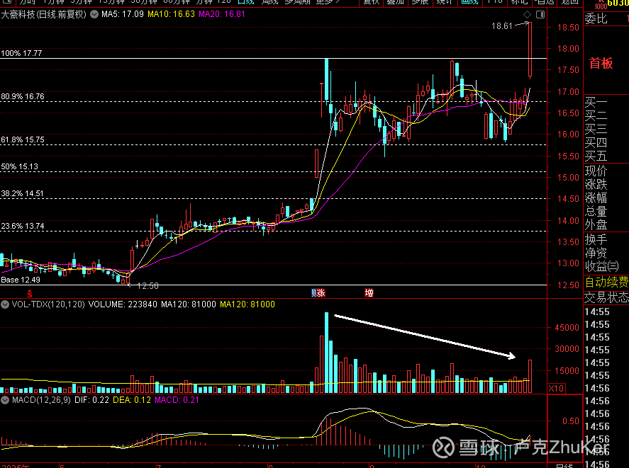 大豪科技,0.618支撑之上的二次建仓类型,今日涨停突破,不需要放量,筹码高度集中,缩量小K线回踩短期均线可重点关注。