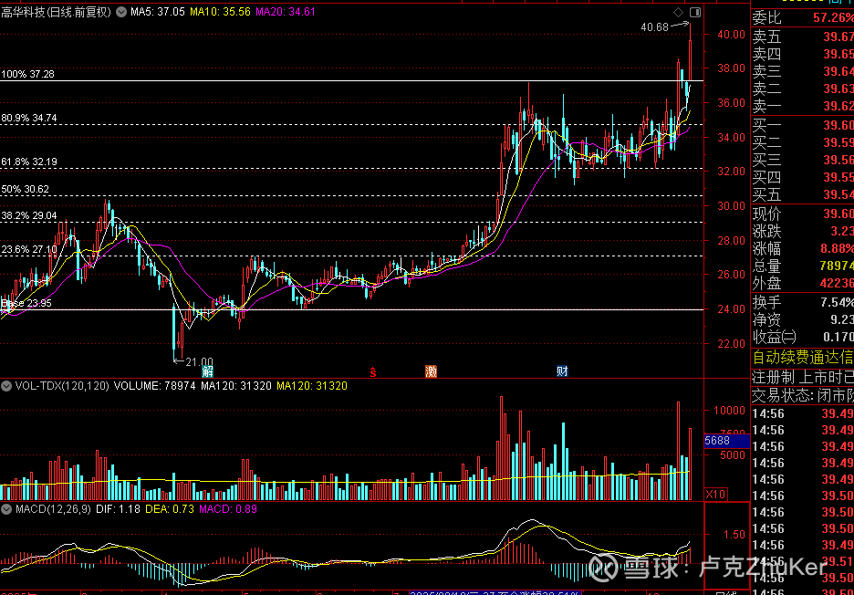 高华科技,0.618支撑之上的二次建仓类型,量能和K线形态的同步放大,大阳线突破,缩量小K线回踩短期均线可关注。
