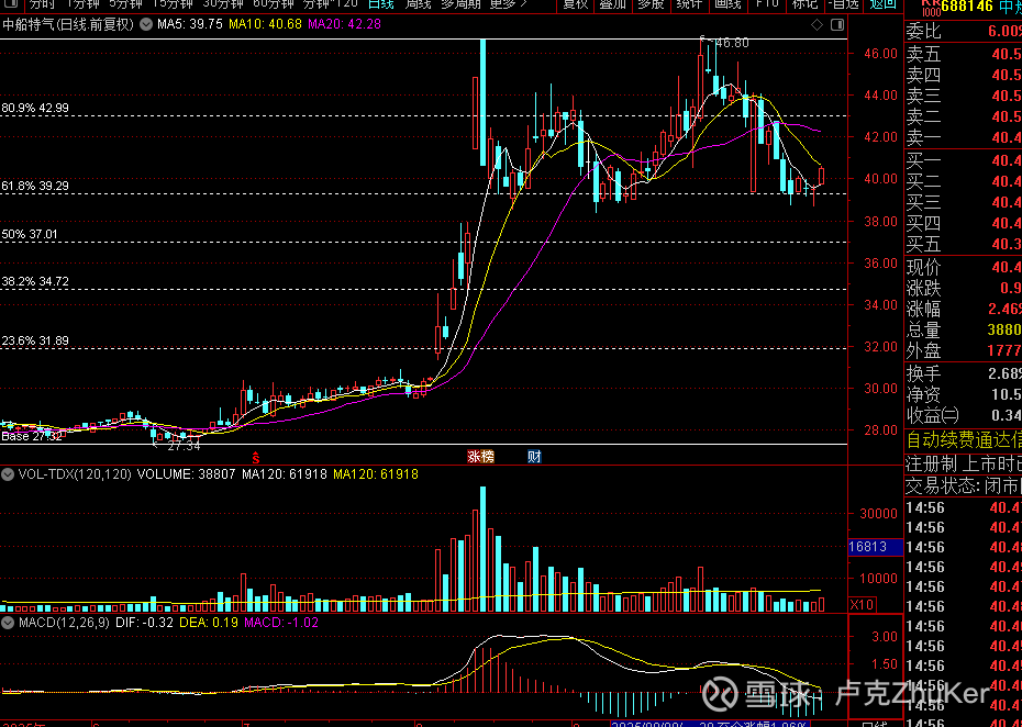 中船特气,0.618位支撑之上的二次建仓类型,目前处于洗盘阶段,可左侧思路在支撑位附近布局底仓。