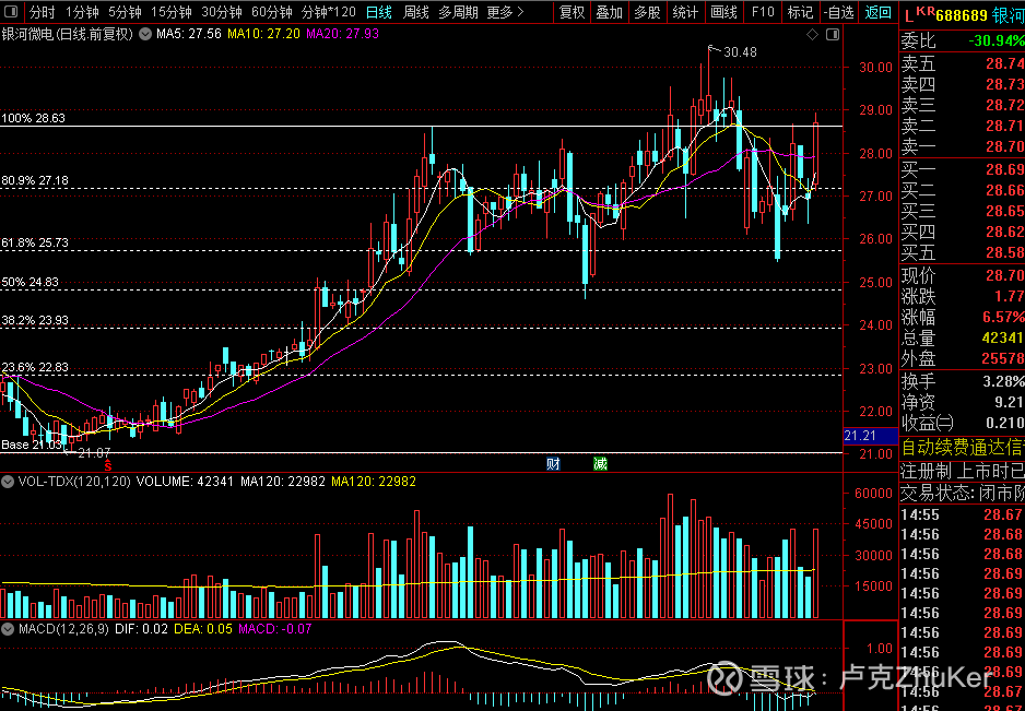银河微电,0.618位支撑之上的二次建仓类型,目前处于洗盘阶段,重回20日线之上,缩量小阴线可以关注。