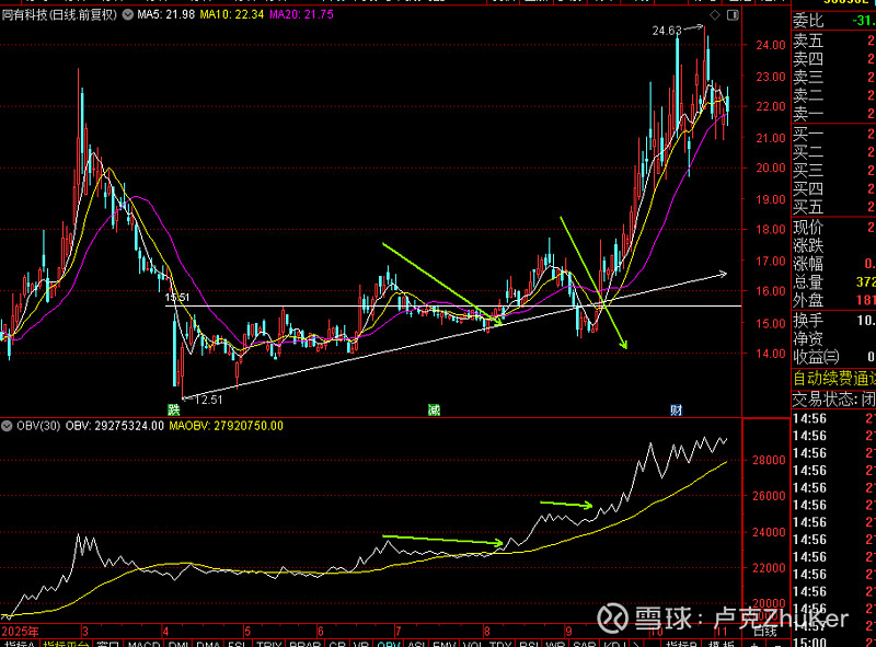 条件四,把指标调成OBV量能加强指标,只看股价下跌段OBV指标的走势,股价大幅度下跌,指标线确能温和下跌或者走平,最好不跌破均黄线