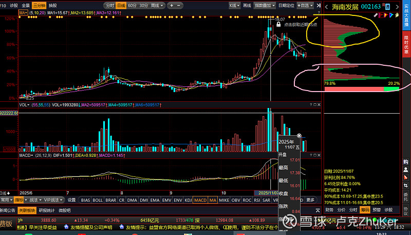 11月7号,底部顶格筹码依然不动,上方高位筹码开始有加长趋势,有潜在的出货能力