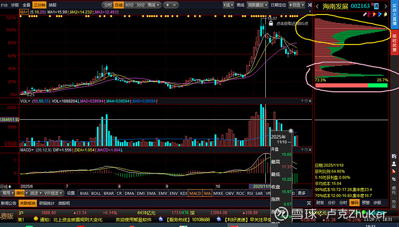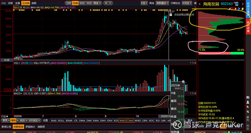 11月11日,底部顶格筹码彻底缩短,上方高位筹码加长顶格不动,机构把大部分的低位筹码派发给了高位接盘的散筹,达到了大部分的筹码的出货