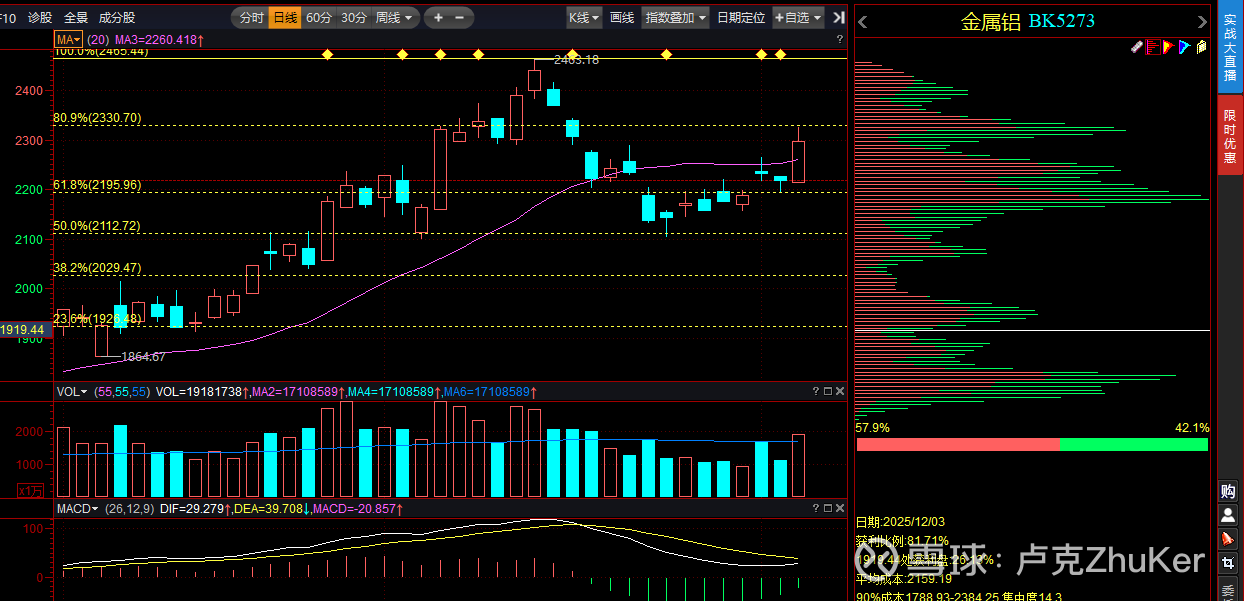 $怡球资源(SH601388)$ 铝重新收复失地,指数层面重新回到了20日线之上,筹码也在0.618位附近重新顶格加长,今天也同样是突破了筹码峰,20日线之上可以看三个交易日是否站稳了,强势的大票云铝股份基本已经收复了所有的下跌,虽然怡球和万方短期表现一般,但也会慢慢修复上去的,怡球看的还是弹性,目标价依然不变查看图片