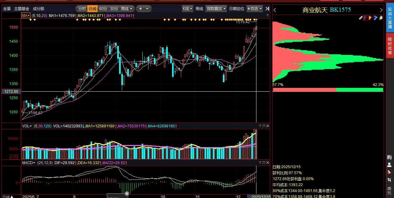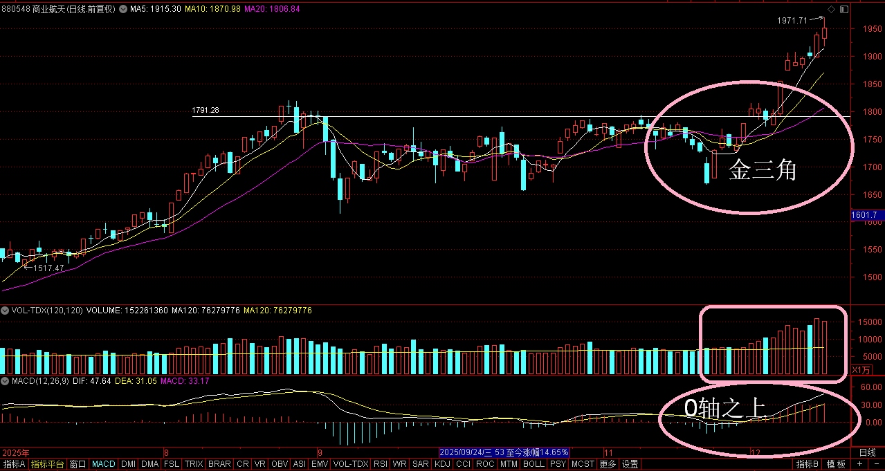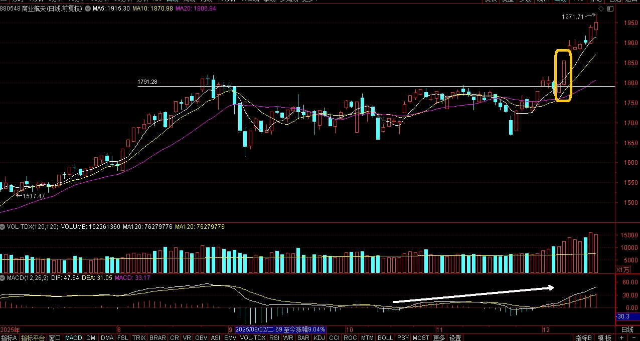 商业航天板块指数同步这三天大盘指数的量能,明显也是放量的,是放了非常大的量能,并且都处于120日均量线之上,那么我们想到的是什么,原来大盘指数增量资金的去向问题是体现在这个板块,资金都在往这个方向进攻,这就是指数与板块的共振,达到存量环境下强势的能力,我们还可以看到的是大盘在缩量的时候,商业航天板块依然是持续保持放量的,就比如今天,大盘指数今天相比上周五又是缩量的,但是商业航天板块在5日线上继续保持着放量的形态,这是短期强势的再次加强。