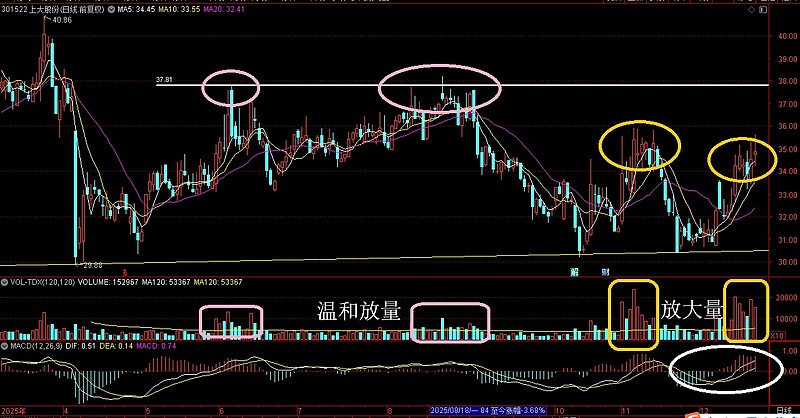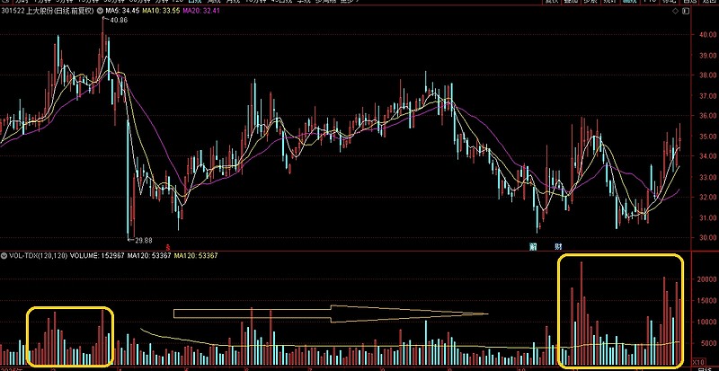也是一样的思路,阶段顶部的量能明显是小于阶段底部的量能的