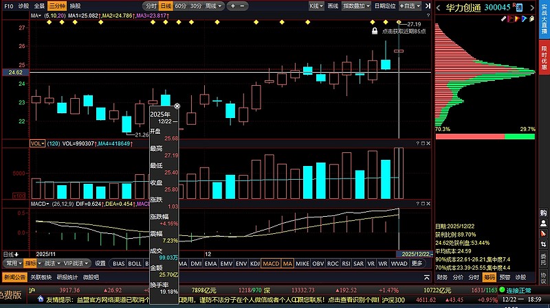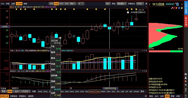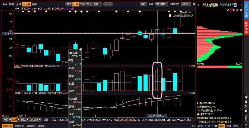 12月17日快速缩半量的调整,股价继续保持在顶格筹码24.50附近