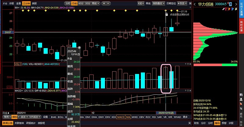 12月12日是筹码在放量横盘区间加长顶格的第一天,均价在24.50附近