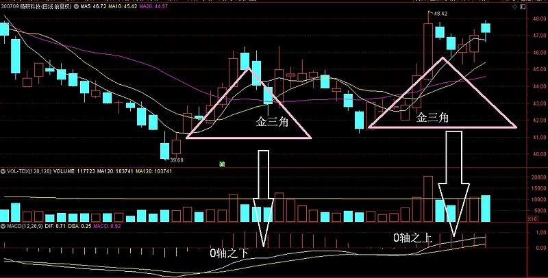 底部两次金三角,第一次MACD处于0轴之下,是无效的金三角,第二次MACD处于0轴之上,且5日线金叉20日线放量明显,是属于有效的金三角形态,也是最好的基石底座