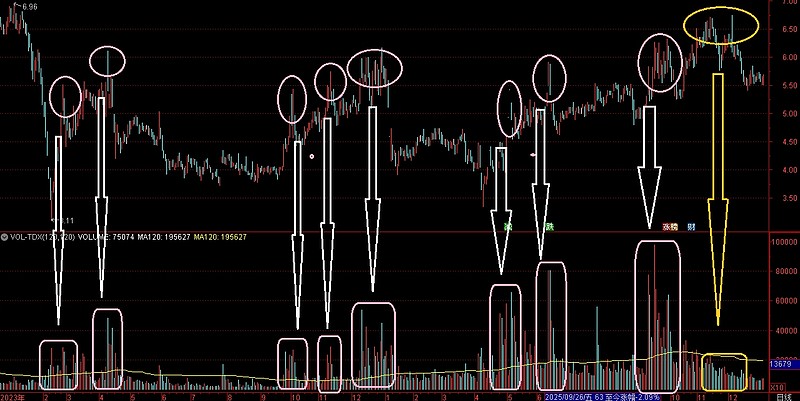 但是当不同的顶出现的时候,是否值得我们关注,黄色圈子股价创了新高,量能确是缩量的形态,是不是不一样了,缩量创新高的意义在于机构筹码的稳定,控盘度的大幅度提升,我们可以看到左边的粉色圈子的复合顶是放了巨量的,表明这里有大量的筹码交换,是机构的吸筹还是出货,答案是显而易见的,假如是出货,股价只会往下走了,即便是往上走为自己解套,只会呈现放量的形式,这里能缩量覆盖前面巨量的复合顶,大概率可以理解为机构在这个放巨量的复合顶拿到了足够多的筹码,股价继续向上也不会有太多的分歧了,因为大部分分歧已经在放量复合顶释放,从大分歧到筹码的稳定,这或许就是机构操盘留下的痕迹