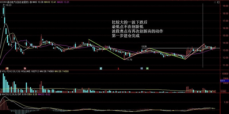 回到走势上,前期有一波主升浪,下跌回调阶段第一次的最低点并没有守住,再次创了新低,这是达不到机构建仓能力,我们要找的是下跌后的最低点不在创新低,波段高点有再次创新高动作的走势
