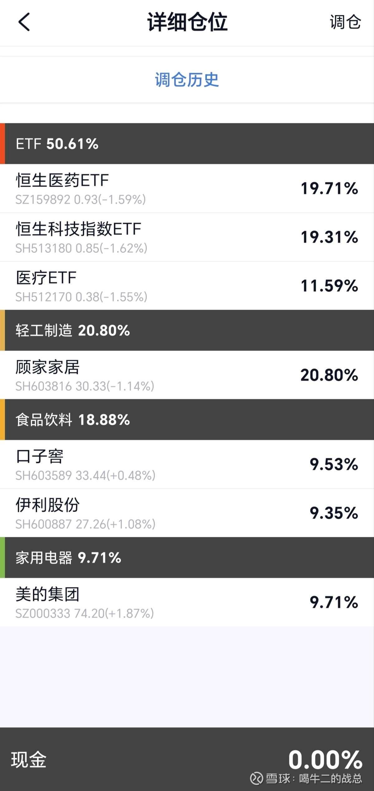 看了一下我的持仓,顾家下跌📉3.81%、医疗 ETF下跌📉1.55%、伊利📉下跌1.6%,美的📉下跌0.2%,基本上是全军覆没。