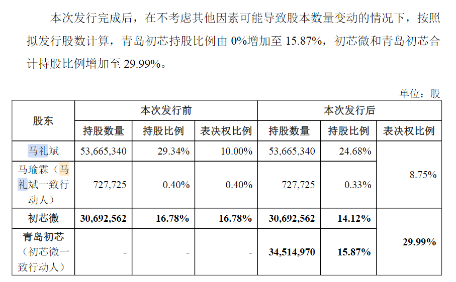 发行完成后,青岛初芯持股比例由0%增加至15.87%,初芯微和青岛初芯合计持股比例增加至29.99%。马礼斌和一致行动人的合计持股比例将为25.01%,表决权比例将为8.75%。