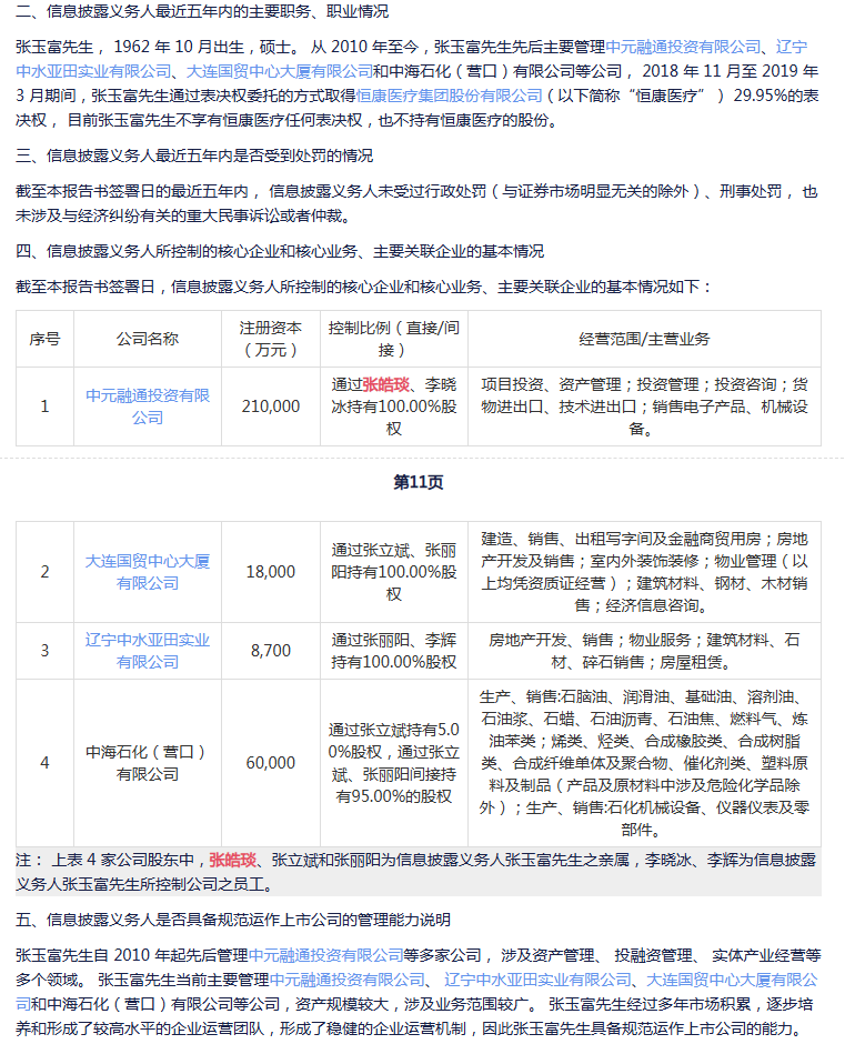 张玉富在2018年就从直接投资人中退出了中元融通投资,但在通化金马2019年的公告中,信息披露义务人是否具备规范运作上市公司的管理能力说明一项中提及,张玉富先生当前主要管理中元融通投资有限公司、辽宁中水亚田实业有限公司、大连国贸中心大厦有限公司和中海石化(营口)有限公司等公司,资产规模较大,涉及业务范围较广。
