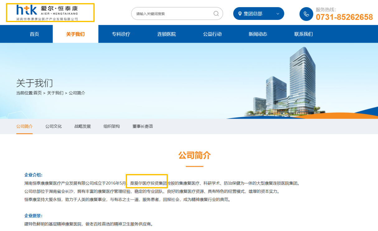 值得注意的是,爱尔系方面看起来还临时修改了湖南恒泰康官网信息。财闻在2月6日浏览湖南恒泰康官网时,其企业名称标识中还带有“爱尔”字样,公司简介中亦提及“是爱尔医疗投资集团控股的大型康复连锁医院集团”。