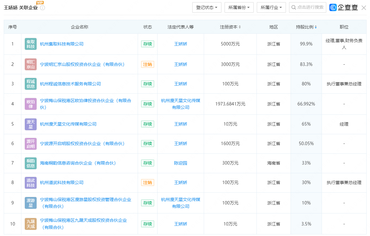 企查查显示,王娇娇目前共持股8家关联公司,合计注册资本约9093万元,公司注册地集中在杭州、宁波、海口三地,经营范围多以资产管理、商业信息咨询为主。