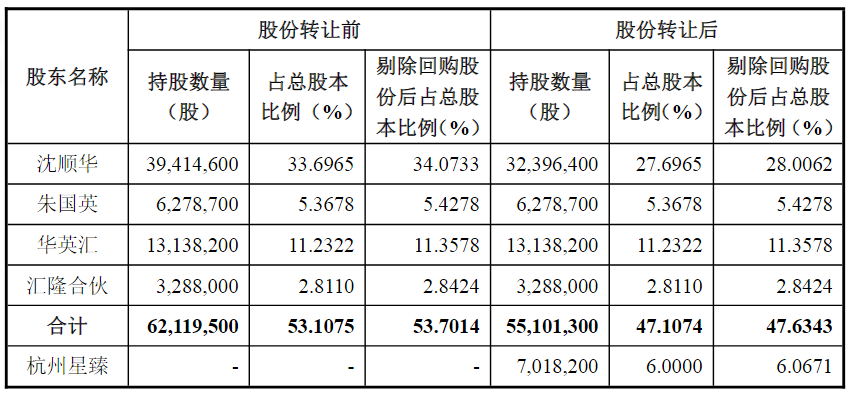 交易完成后,沈顺华及其一致行动人合计持股比例将从53.11%降至47.63%,仍保持控股地位;杭州星臻则晋升为公司第三大股东。