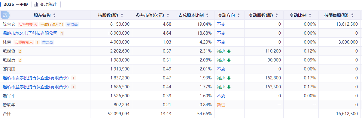 2026年1月,陈宜文又启动第二次减持计划,拟通过集中竞价方式减持合计不超过50万股,占公司总股本的0.535%。预计在本次减持后,上述两家平台将分别持有138.50万股、104.20万股泰福泵业股票,此外陈宜文、林慧及其一致行动人“温岭市地久电子科技有限公司”还持有1815万、400万、1800万股股票,若按3月23日收盘价34.9元/股计算,合计对应市值约14.86亿元,对比2025年4月低点已翻倍。