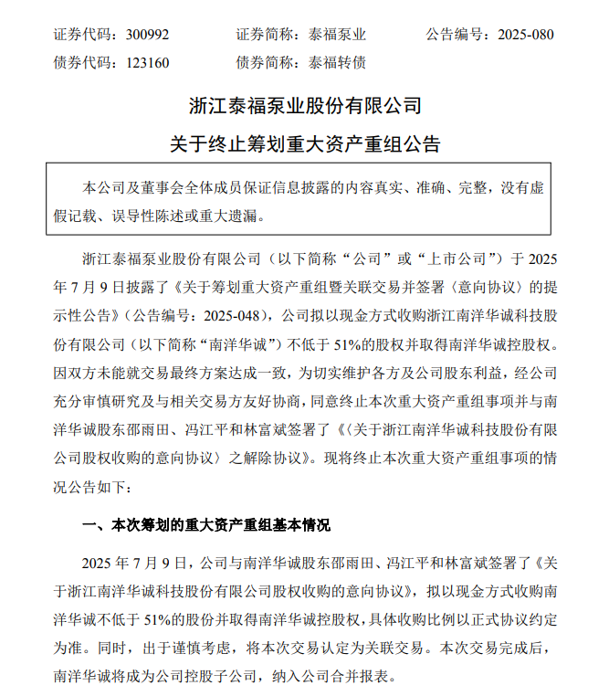 泰福泵业关于终止筹划重大资产重组公告,图源:公司公告