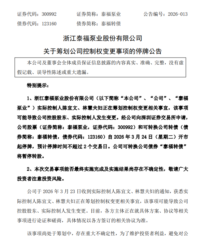 3月23日盘后,泰福泵业(300992.SZ)公告称,实控人陈宜文、林慧夫妇正在筹划控制权变更相关事项,可能导致公司控股股东发生变更,其股票自3月24日起停牌,预计不超过2个交易日,其间可转债暂停转股。