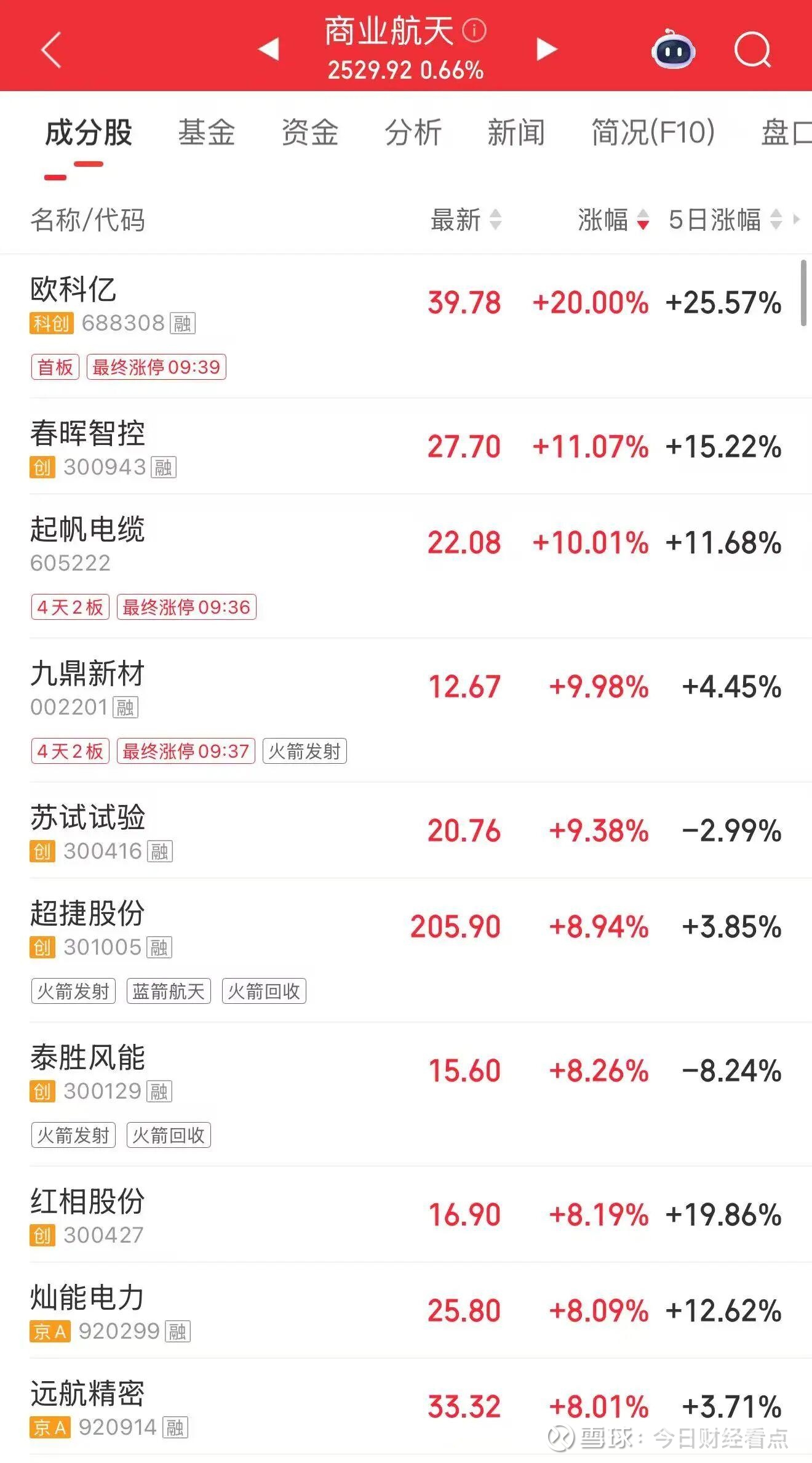 今天商业航天板块低开高走,截至发稿,欧科亿、起帆电缆、九鼎新材等个股涨停,其中欧科亿“20cm”涨停,起帆电缆、九鼎新材均走出4天2板。