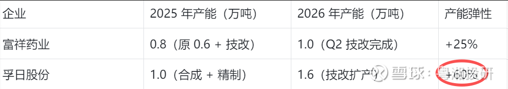 注:富祥药业 2025 年实际产能为 8000 吨,2026 年通过技改扩至 1 万吨;孚日股份 2025 年产能达 1 万吨(远超用户提及的 0.5 万吨),2026 年精制产能技改后扩至 2 万吨,实际有效产能 1.6 万吨。