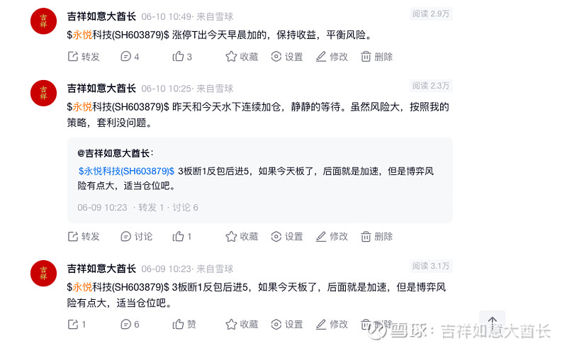 $永悦科技(SH603879)$ 低空里唯一拿的一只。不是说今天涨停了,在这说。st的时候就跟着城哥做,吃了3板之后,然后3进5的高点,6月10号T出加仓部分,但还是有仓位在6月11号被套,当然我的成本很低,不能说是被套,但利润减少了。但是,从6月11号开始波段下跌,开始陆续加仓,一直到今天,又突破了6月10号的7.38高点。我想说的是:股票都是走波段,所以在波段回调的时候,记得买一点,要不拉升你跟不上,除非你很牛X,能每次都把我住顶底。拉升突破或者连涨的时候,记得减仓。就这么一点操作方法,你只要能用好,绝对是能挣钱的。还有就是,耐心真的很重要,从6月10号,到现在7月22号,拿的住,还是一样挣钱,永远别只看一天!