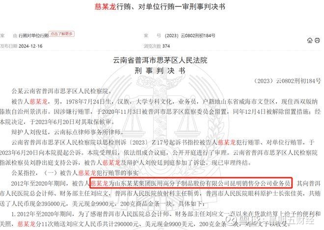 判决书显示,慈某龙,男,1978年7月24日生,汉族,大学专科文化,业务员,户籍地山东省威海市文登区,现住西双版纳傣族自治州景洪市。因涉嫌行贿罪,于2020年11月3日被普洱市思茅区监察委员会留置,同年12月4日被解除留置措施;经法院决定,于2023年6月20日对其取保候审。