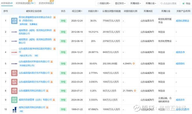 威高股份对外投资企业众多,其中包括了已经上市的山东威高血液净化制品股份有限公司,以及科创板上市的山东威高骨科材料股份有限公司。
